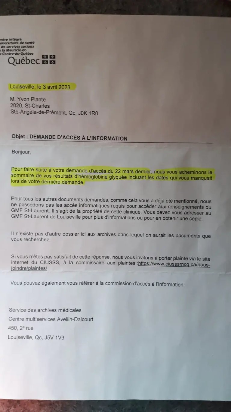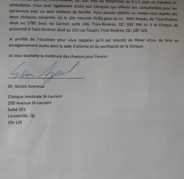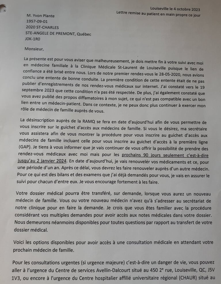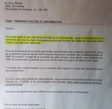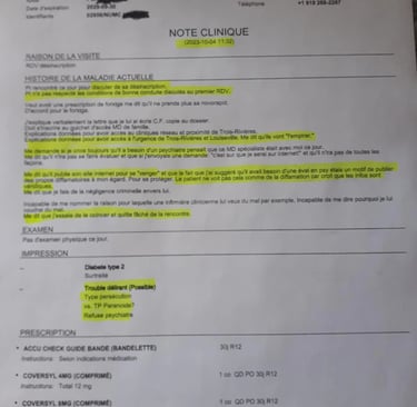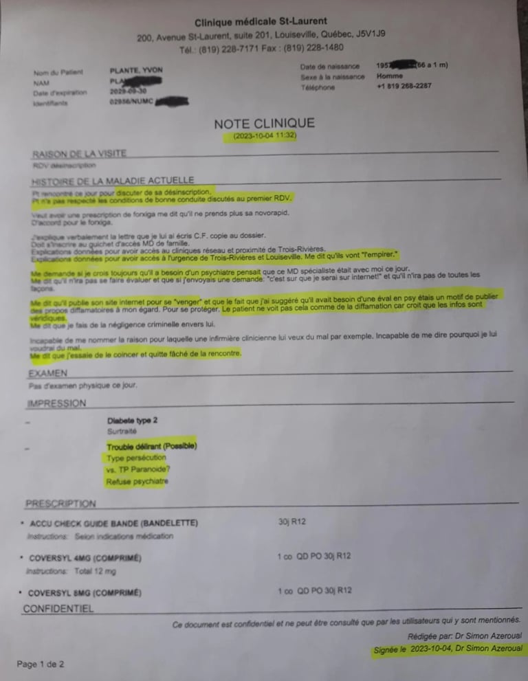Dans un commentaire du 4 octobre 2023, Yvon Plante a exprimé sa frustration face aux problèmes de stockage et de traitement de l'insuline. Il a constaté une aggravation des symptômes de santé, notamment des palpitations cardiaques et des troubles du sommeil, ainsi que des difficultés d’accès aux soins médicaux et aux rendez-vous. Yvon Plante a affirmé qu'il avait été intentionnellement négligé par les professionnels de la santé, ce qui a entraîné une aggravation de son état. Malgré ses inquiétudes concernant les effets secondaires de certains médicaments, il s’est senti obligé de continuer à les utiliser en raison du manque d’alternatives. Yvon Plante a critiqué le Dr.Simon Azéroual pour négligence présumée et a exprimé sa défiance envers le système de santé. Ces expériences lui ont donné le sentiment de ne pas être soutenu et de lutter pour gérer efficacement sa santé.