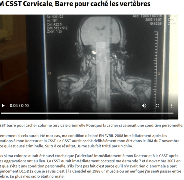 7 et 8 novembre 2007IRM CSST normale a part léger pincement D11 D12 et radio normale. Comment après les aggravations après que j'ai déclaré immédiatement début 2008 peuvent-ils me dire que j'avais ça avant (criminelle et en cachant ses résultats avec des barres et déposer en preuve la CSST fallait qu'elle me fasse boité et aggravateur mon état pour arriver au diagnostique de fibromyalgie avec la complicité de mon Docteur, pour arriver a leur supposément mon état.)Comment la CSST ne pourrais pas me reconnaître invalide après que c'est sur leur ordre que les professionnelles payer par eux m'ont rendu invalide. faut que les juges sois corrompu pour nier une telle évidence avec preuve qui m'ont refuser en mentionnant que ça n'avait pas de lien avec le litige. Complaisant et criminelle.lien mon site internet plusieurs aggravations criminels.https://www.csst-criminelle.com/355580095