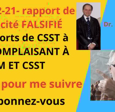 Bloquer par mon Docteur en partant le code de Waddell et en faisant des rapports criminels en complaisance avec RCM et la CSST, le MTQ aux petites créances à plusieurs reprises, etc. j'étais déjà perdant contre le système et mes documents le prouvent. En plus de multiples aggravations volontaires