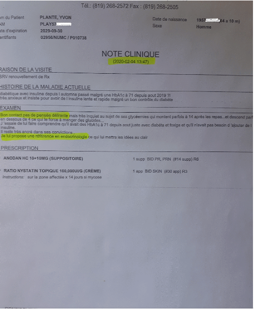 6 jours après je suis rendu délirant. lol 2020-02-10 infirmier suivi Dr. Laferté. Je lui dit par 4 reprise que j'ai une demande par Dr St-Paulin en endocrinologie.