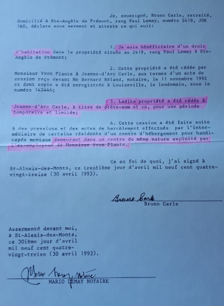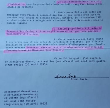 J'ai fais confiance a la belle sœur de mon chum Jeanne D'arc Carle de Ste-Angèle de Prémont pour mettre ses maisons à son nom et par après elle les a garder et fait faillite. J'ai un papier notarié fait par mon chum comme quoi ça été comme prête-nom à cause de l'harcèlement de mon ex-employeur comme démontrer plus haut. Faut dire à sa défense qu'elle s'a fait sûrement influencer par son chum Gilles Lamy.