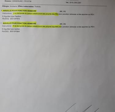 4- elle n'était même pas encore installer près de mes pieds pour faire le test du monofilament elle m'a dit de fermer les yeux. Durant qu'elle me piquait j'ai ouvert les yeux et j'ai vu un cathéter. ( Pris le papillon qui prenne pour les ceux qui ne sont pas capable de prendre les prise de sang et font sur la main avec le cathéter) un cathéter c'est pour sortir du sang ou entrer quelque chose