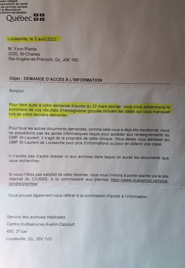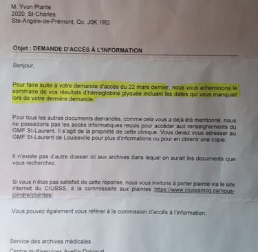 Je lui mentionne que des documents ont été retirés de mon dossier médical de façon volontaire. Je lui mentionne une couple de fait, et elle me dit que ça se peut que la secrétaire ait oublié de l'envoyer